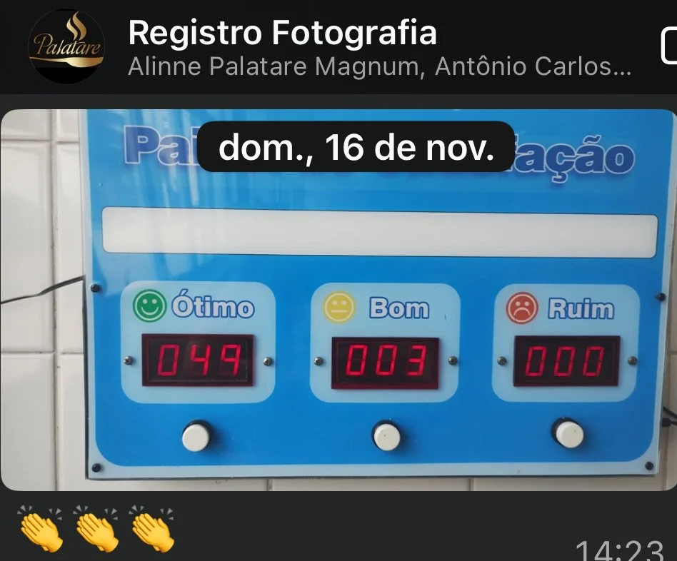 Instalamos painéis eletrônicos de satisfação nos refeitórios, onde os colaboradores avaliam cada refeição como: